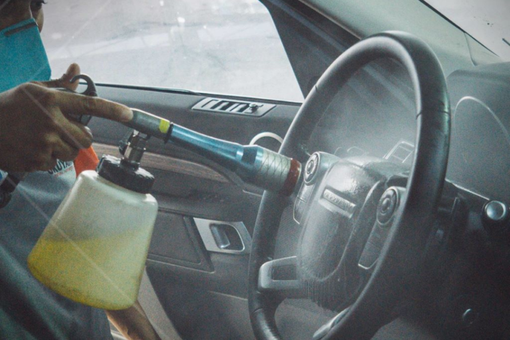 Processo em que se lava a parte interna do veículo, que envolve o teto, forros de porta, bancos e carpete.